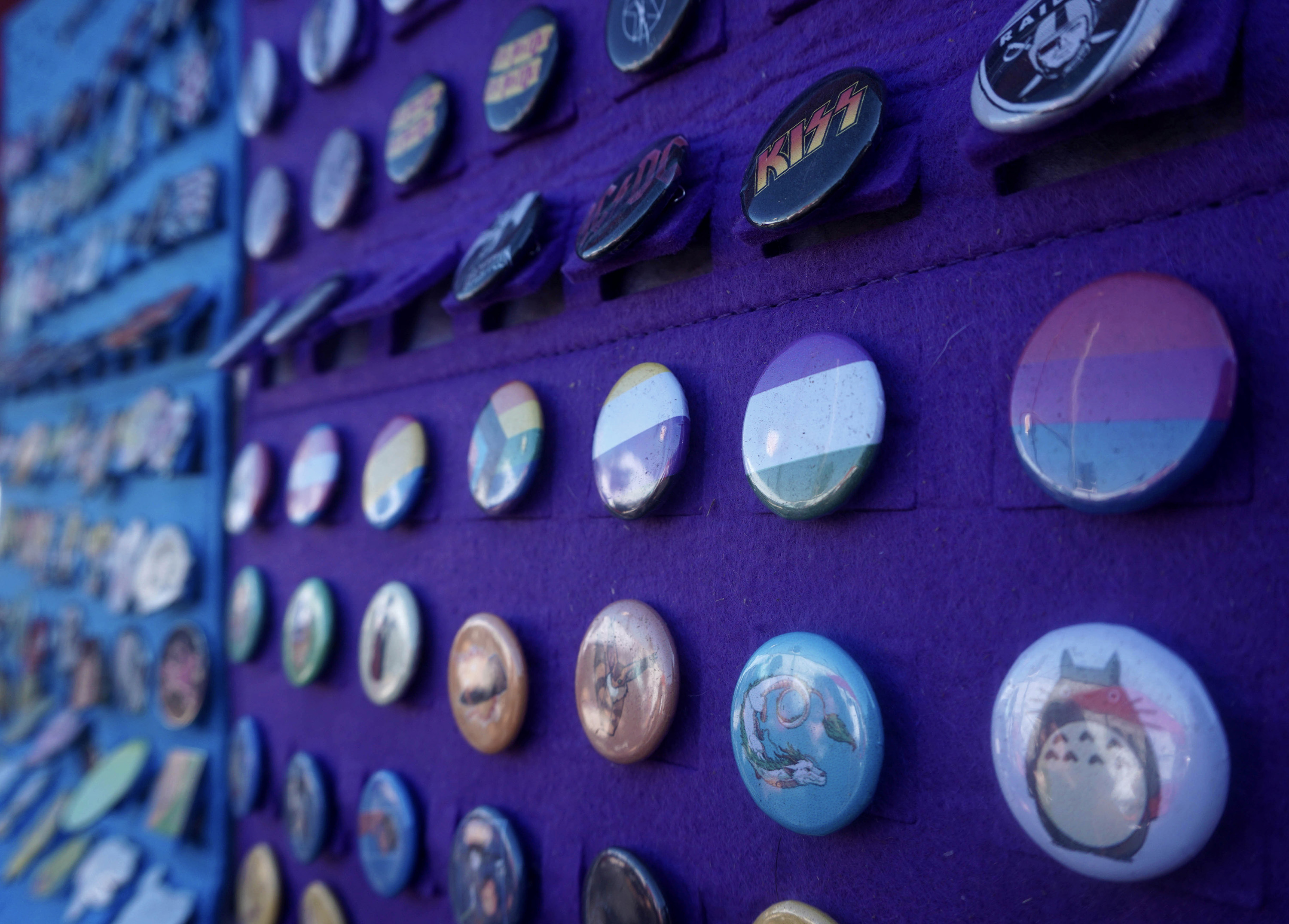 An assortment of pins displaying pride flags on display at a stall. (Colton Lucas)