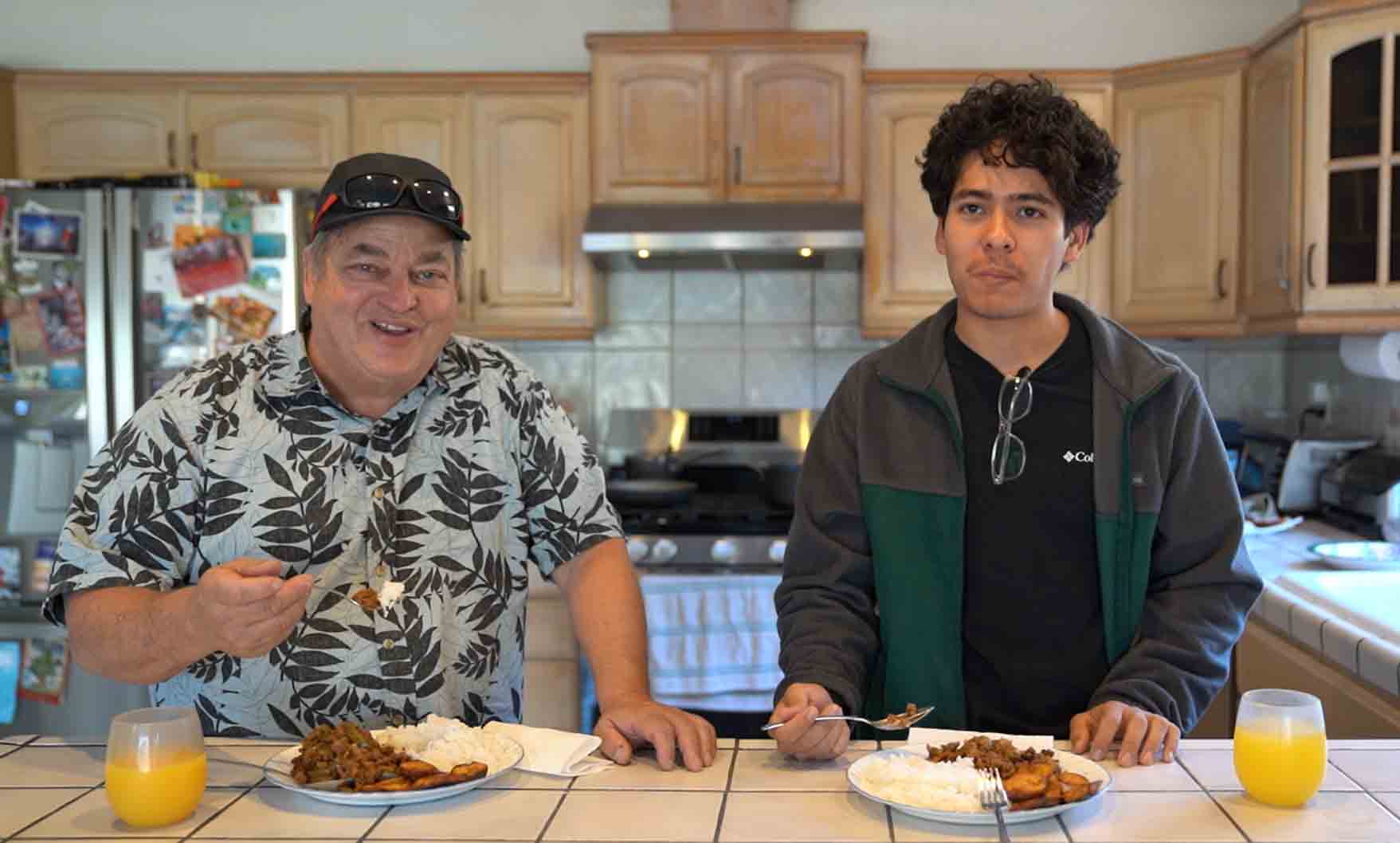After working together on the dish, Picadillo, the two enjoy their work.