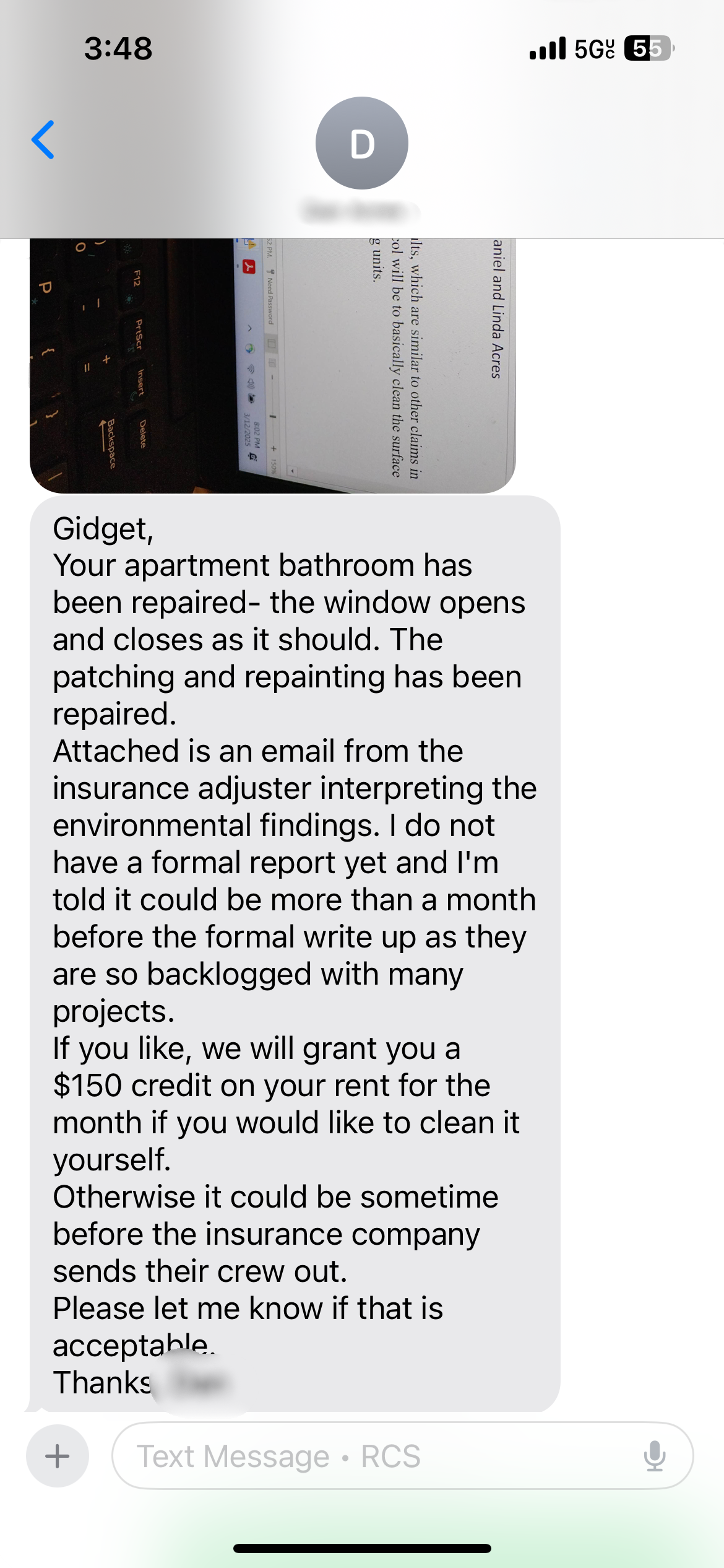 Two weeks later, her landlord contacted her and came to inspect. He responded with a list of items he fixed, without providing written estimates. The landlord claimed insurance tests showed no lead or asbestos, without sharing the physical report. Eventually, he offered a $150 rent discount if she handled the cleanup herself.