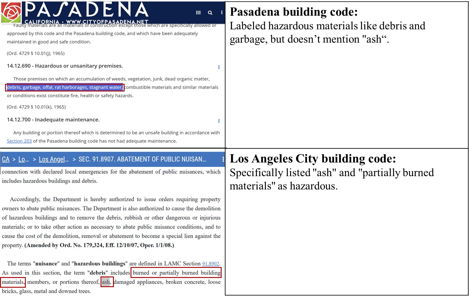 While Los Angeles City names "ash" as debris that contributes to "nuisance" and "hazardous buildings", Pasadena Housing Department does not specifically mention "ash" as a dangerous material in their building code.