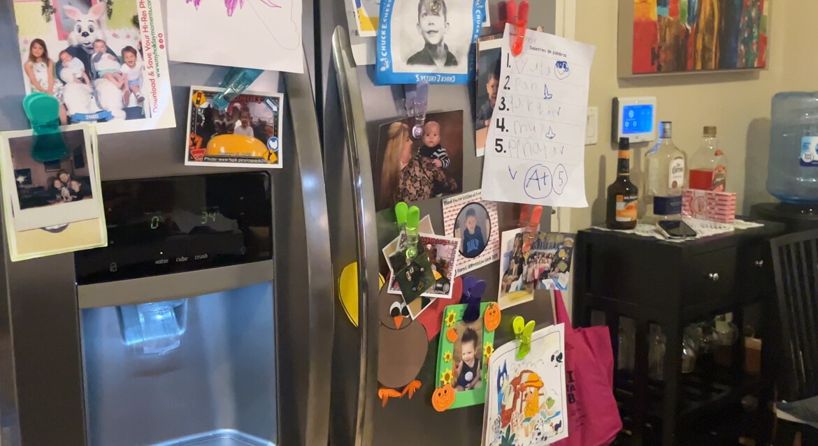 Pictures of her children and their artwork cover Kris Adler’s refrigerator. (Photo by Cheng Li)
