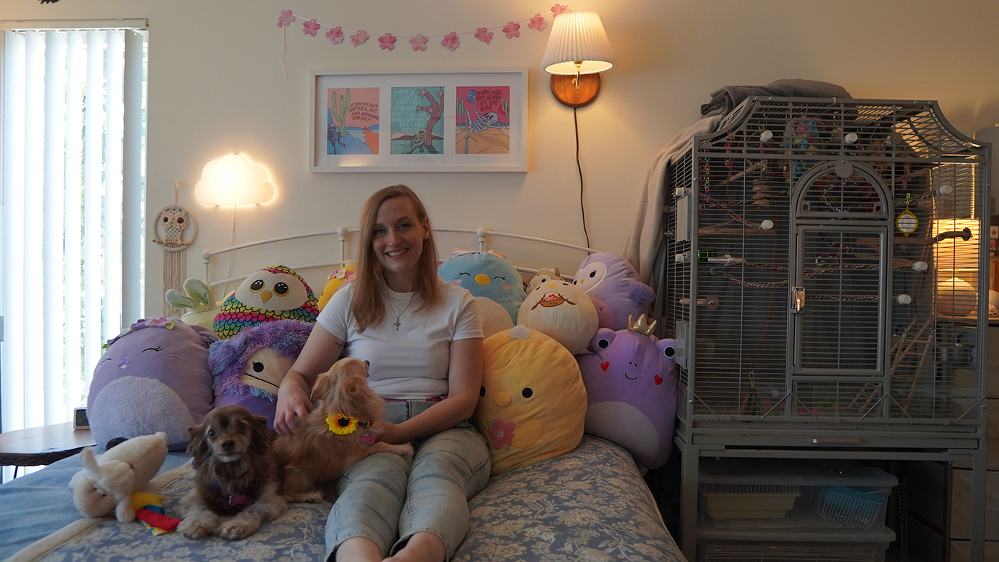 Peters sits on her bed with her two dogs, Ava and Nova, and one of her pet birds in the cage beside her. (Photo by Dominique Williams)