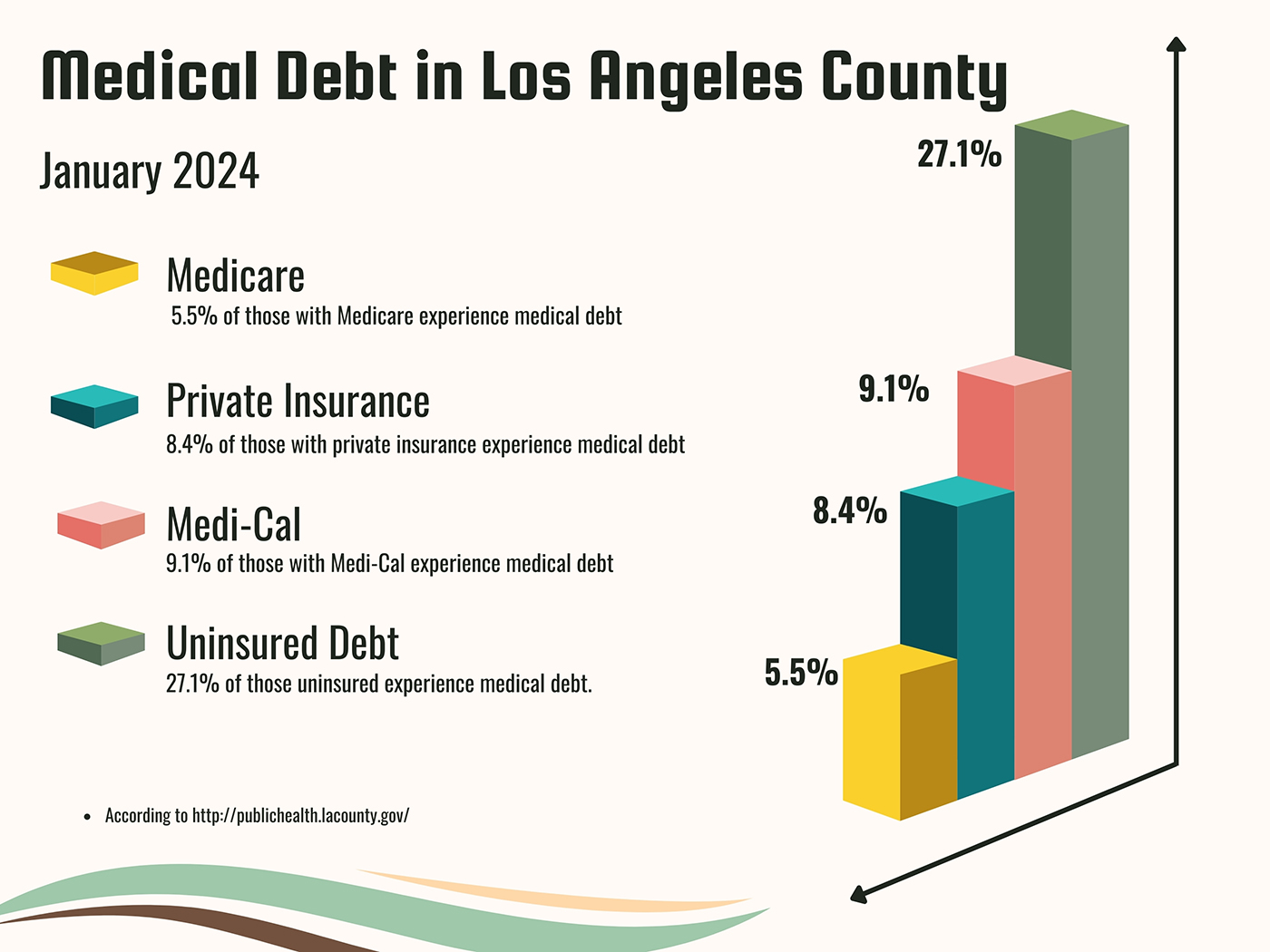 Under the Affordable Care Act, California residents are offered a variety of healthcare coverage options, yet its shortcomings are apparent in the rising levels of debt. Medi-Cal, California’s Medicaid program, insures around 4.7 million people living in L.A. County. Those who do not qualify can find insurance through Covered California, a marketplace for plans that vary depending on income.