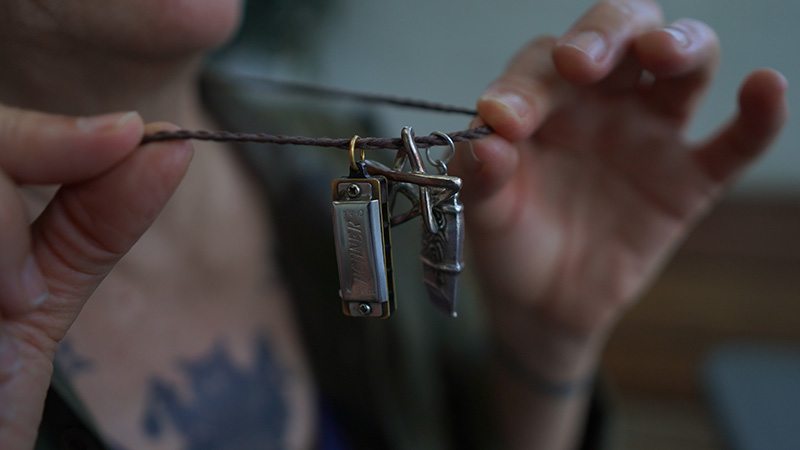 Housden holds up her favorite necklace charms, two of which include a pentagram and a mini harmonica. (Photo by Dominique Williams)