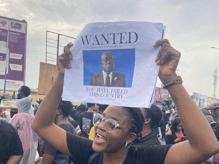 Protest organizer Nasiba Bawa holds "wanted" sign of Ghana's former president Nana Akufo-Addo