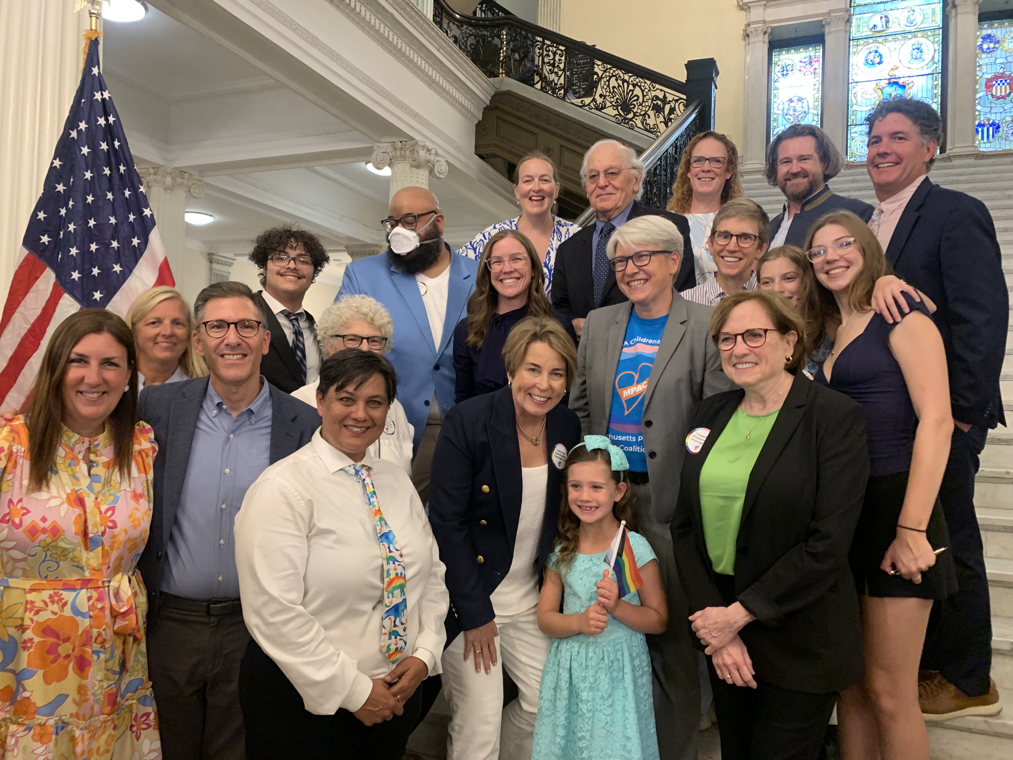 Meg and Ida York beside Governor Healey at the Massachusetts Parentage Act signing ceremony. Photo courtesy of Meg York.