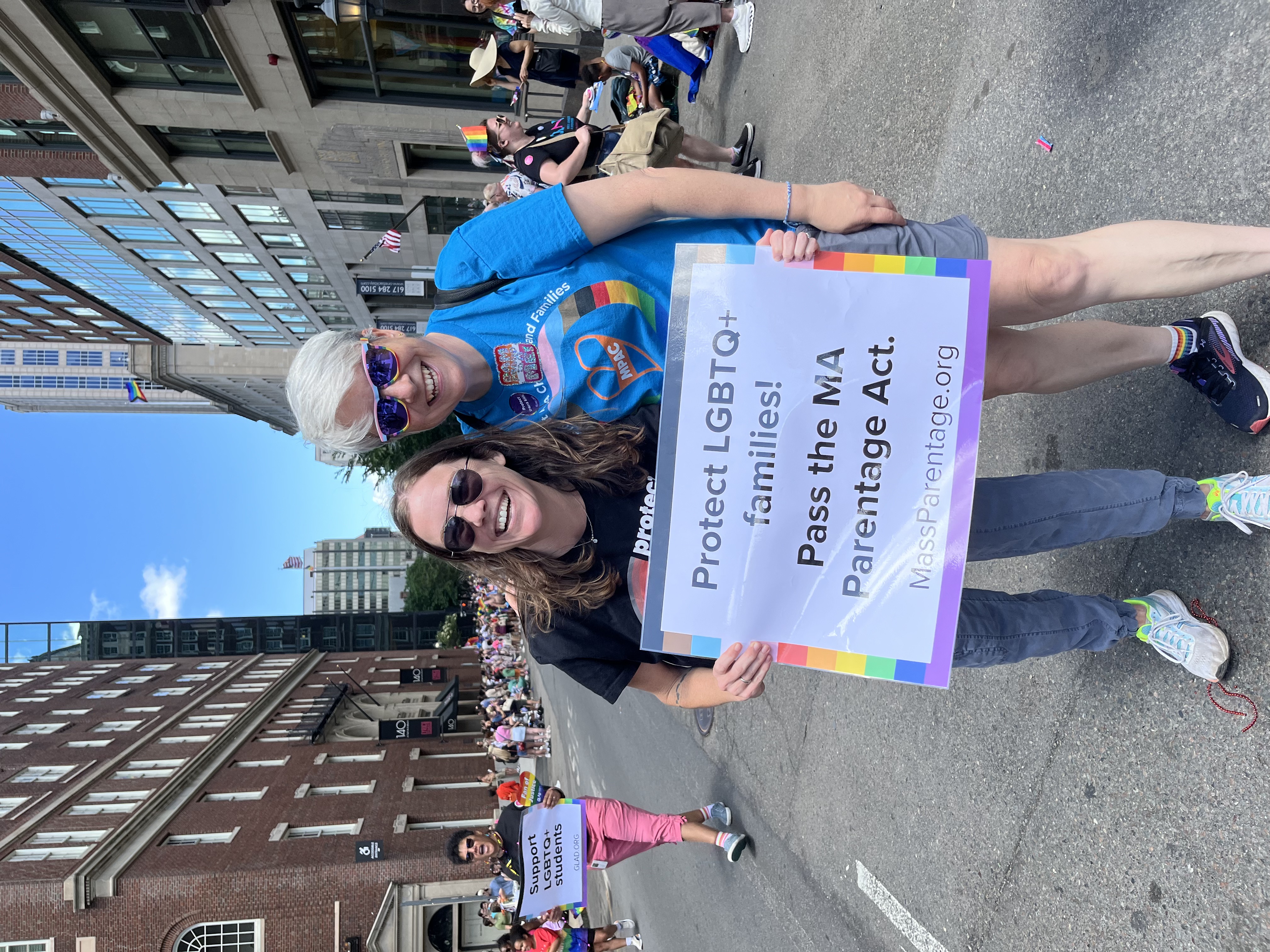 Meg with Polly Croizer, attorney with GLBTQ Legal Advocates and Defenders, at Boston Pride marching for the Massachusetts Parentage Act. Photo courtesy of Meg York.