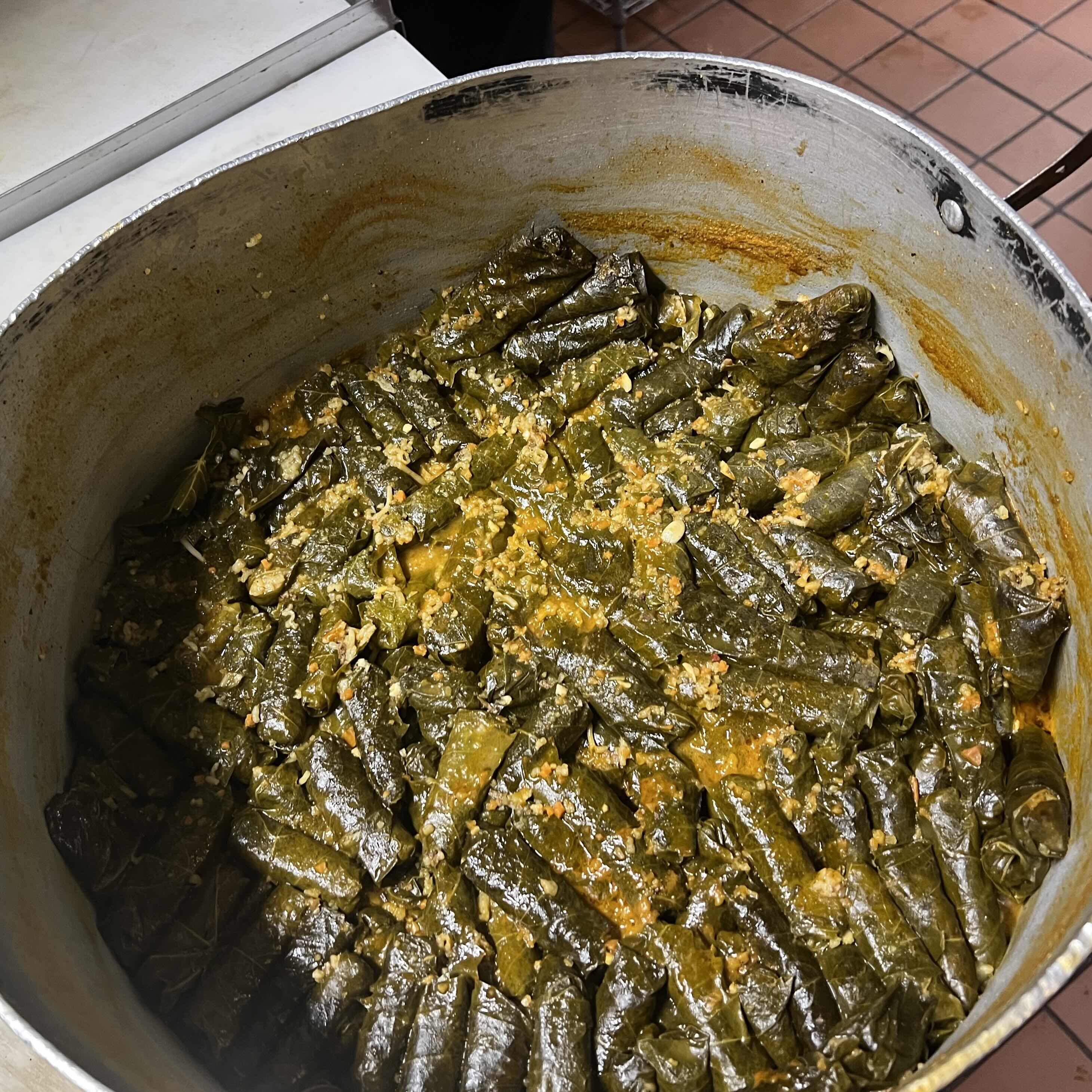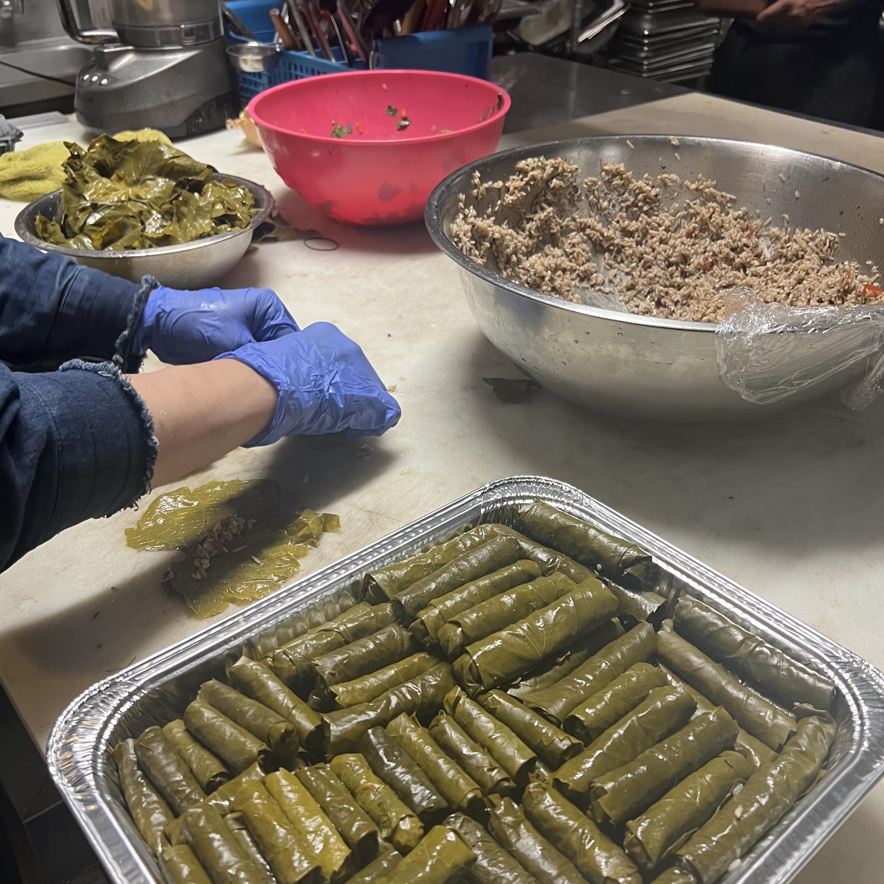 Head chef Layla Mohammad’s traditional Middle Eastern menu reflects the intersecting cultural influences of the Middle East. It includes many foods associated with Palestine such as: stuffed grape leaves, mansaf (a dish made of lamb cooked in a sauce of fermented dried yogurt and served with rice) and knafeh (a dessert pastry made of shredded filo dough and sweet filling) that vary in style in each Middle Eastern country. For example, in Nablus, Palestine, knafeh filling consists of goat cheese, in Turkey, the filling is rich with nutella or pistachios and in Jordan, the filling consists of a sweeter cheese called Akkawi.