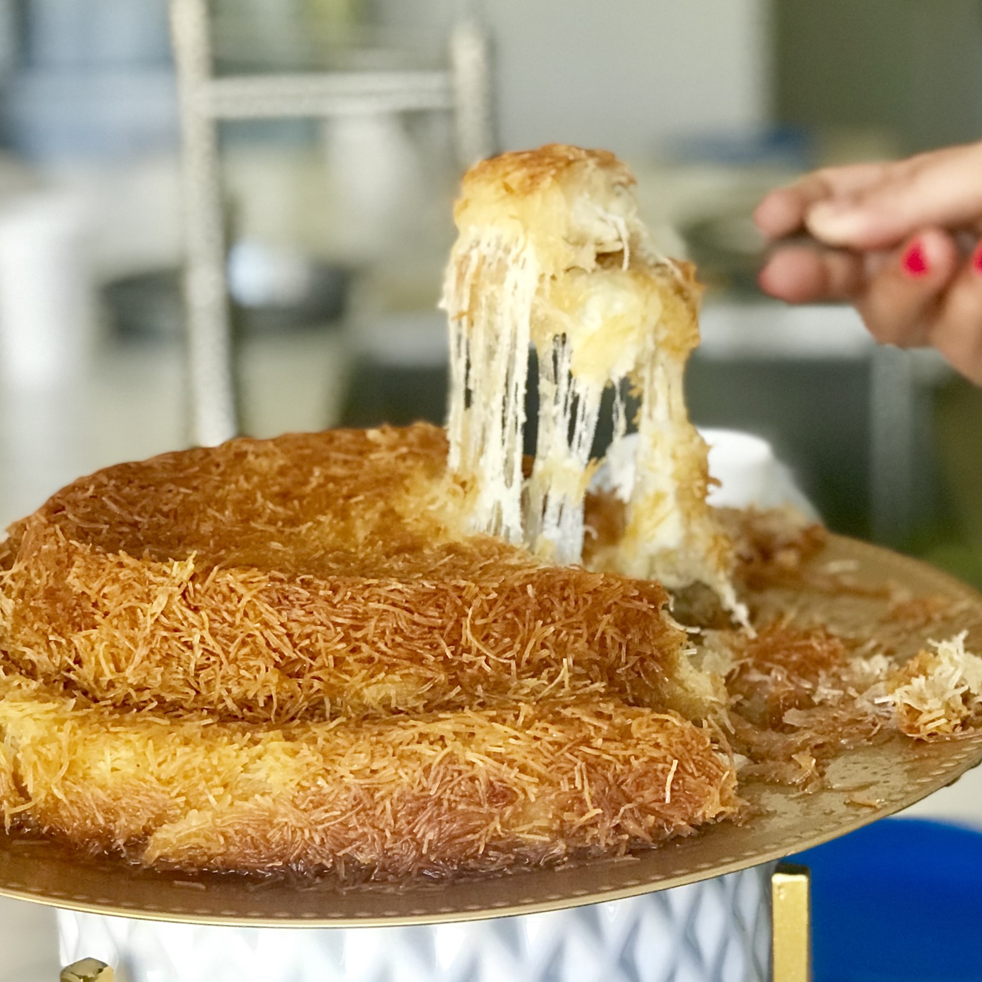 Knafeh, a Palestinian dessert made of shredded filo dough and goat cheese