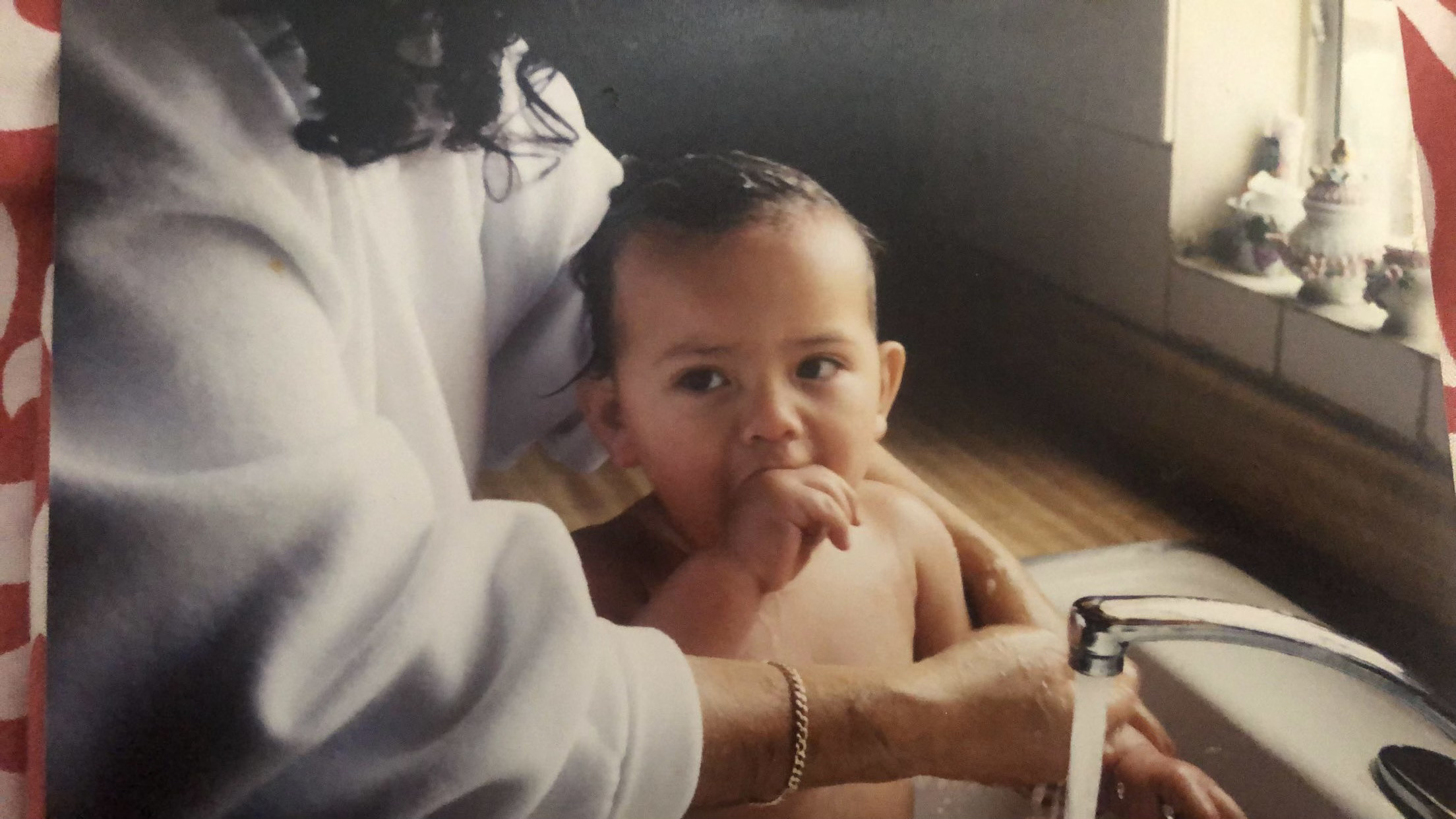 Baby Brandon taking a bath in a sink. Courtesy of Brandon Marroquín.