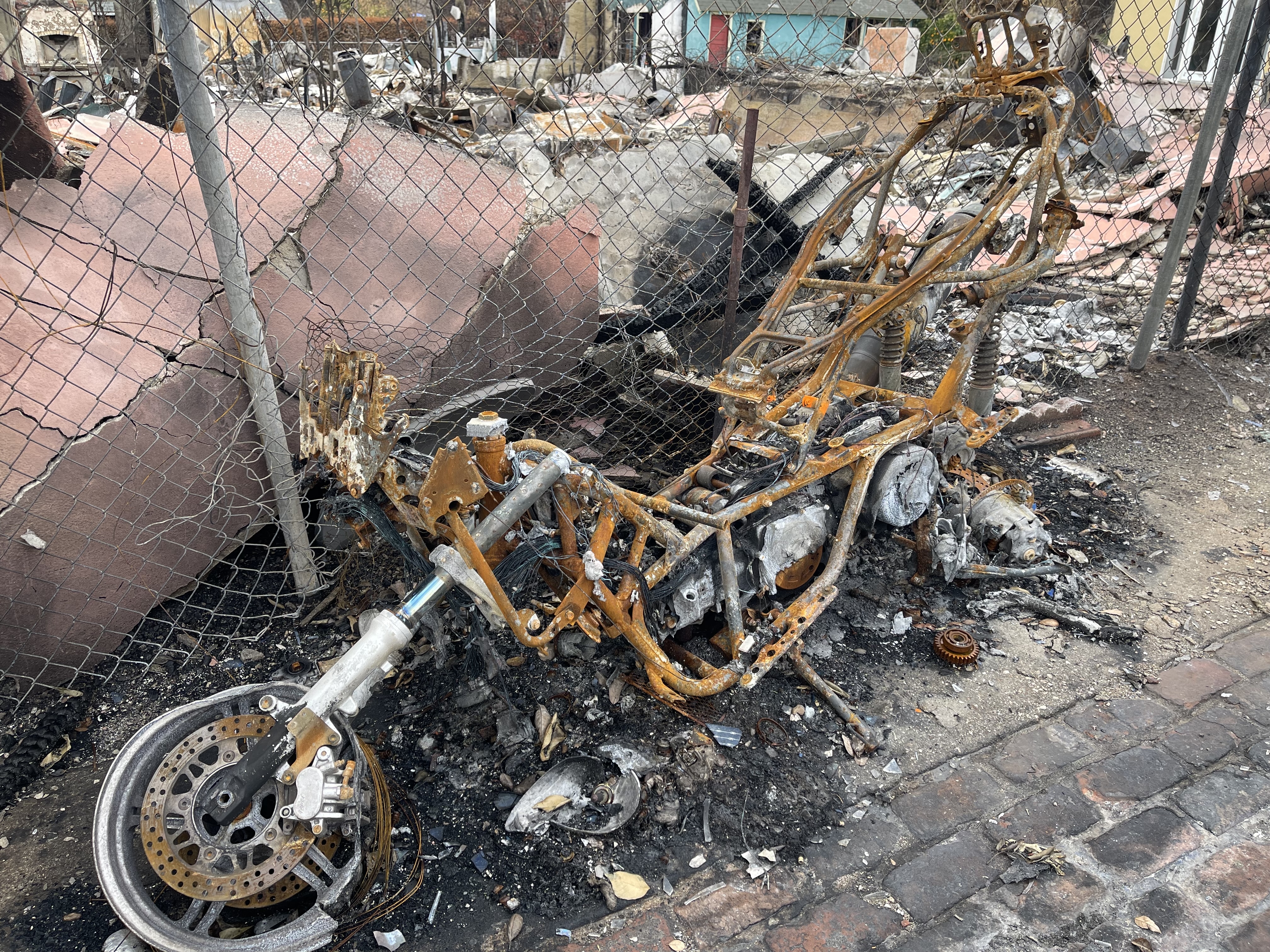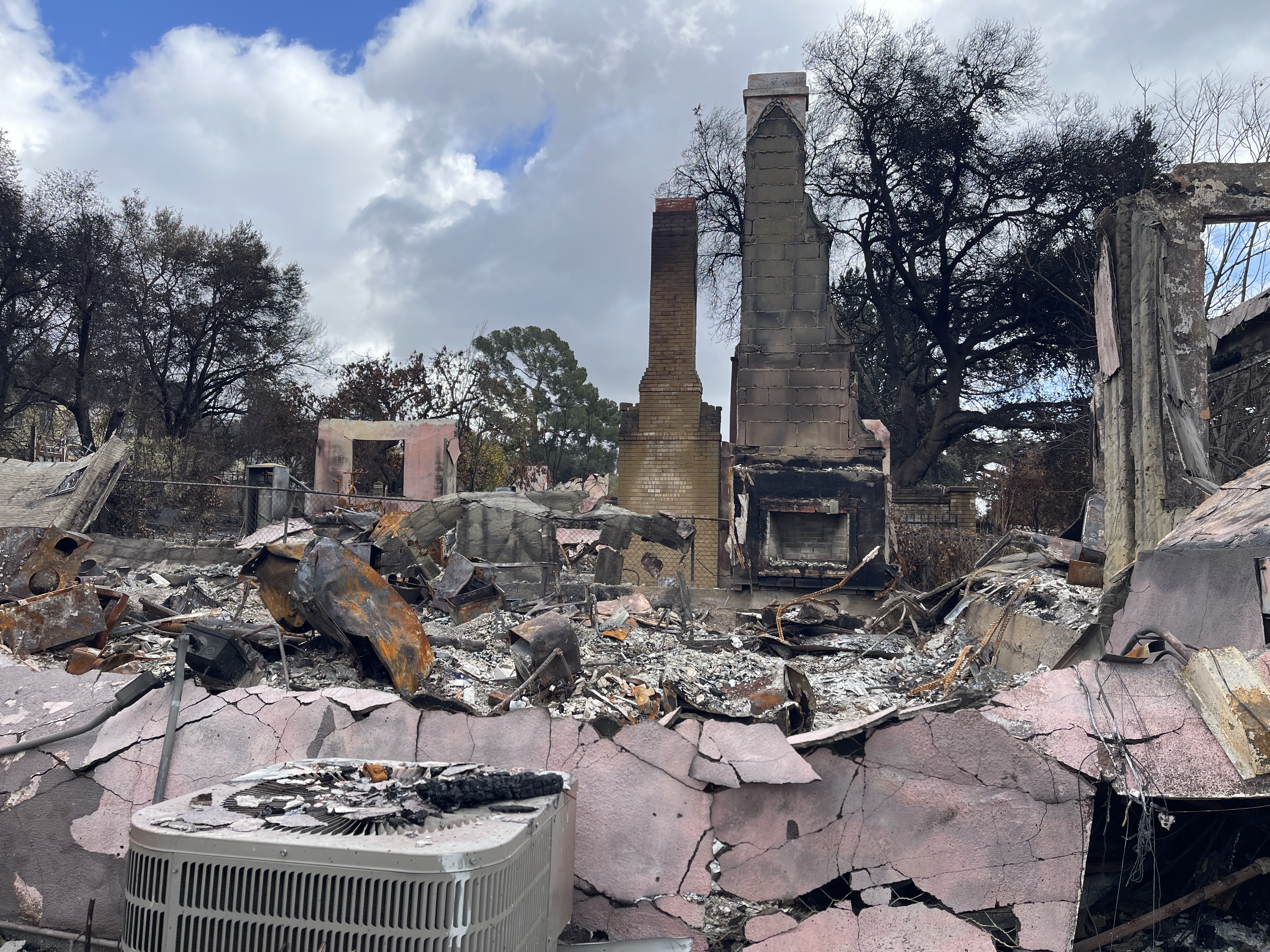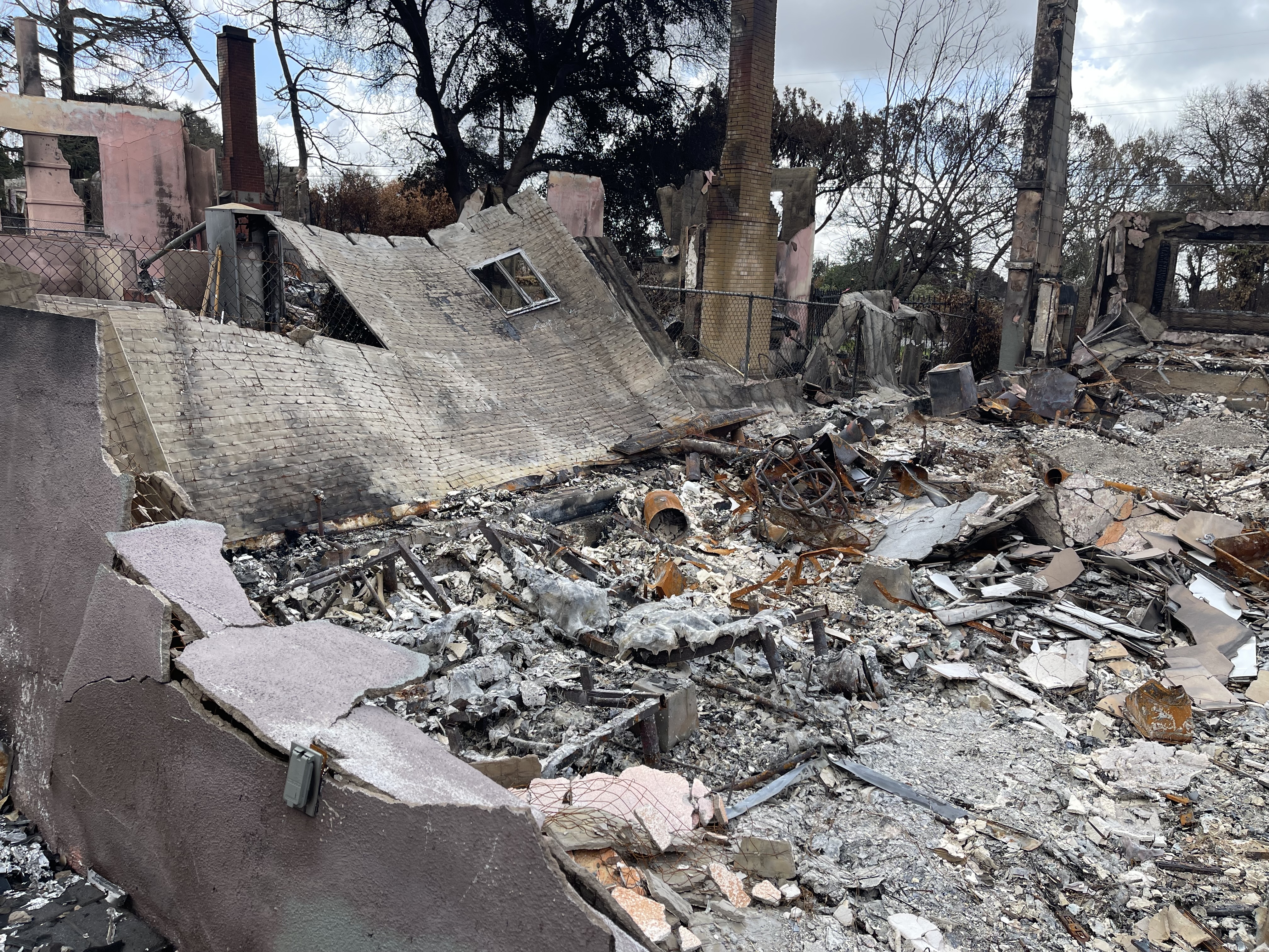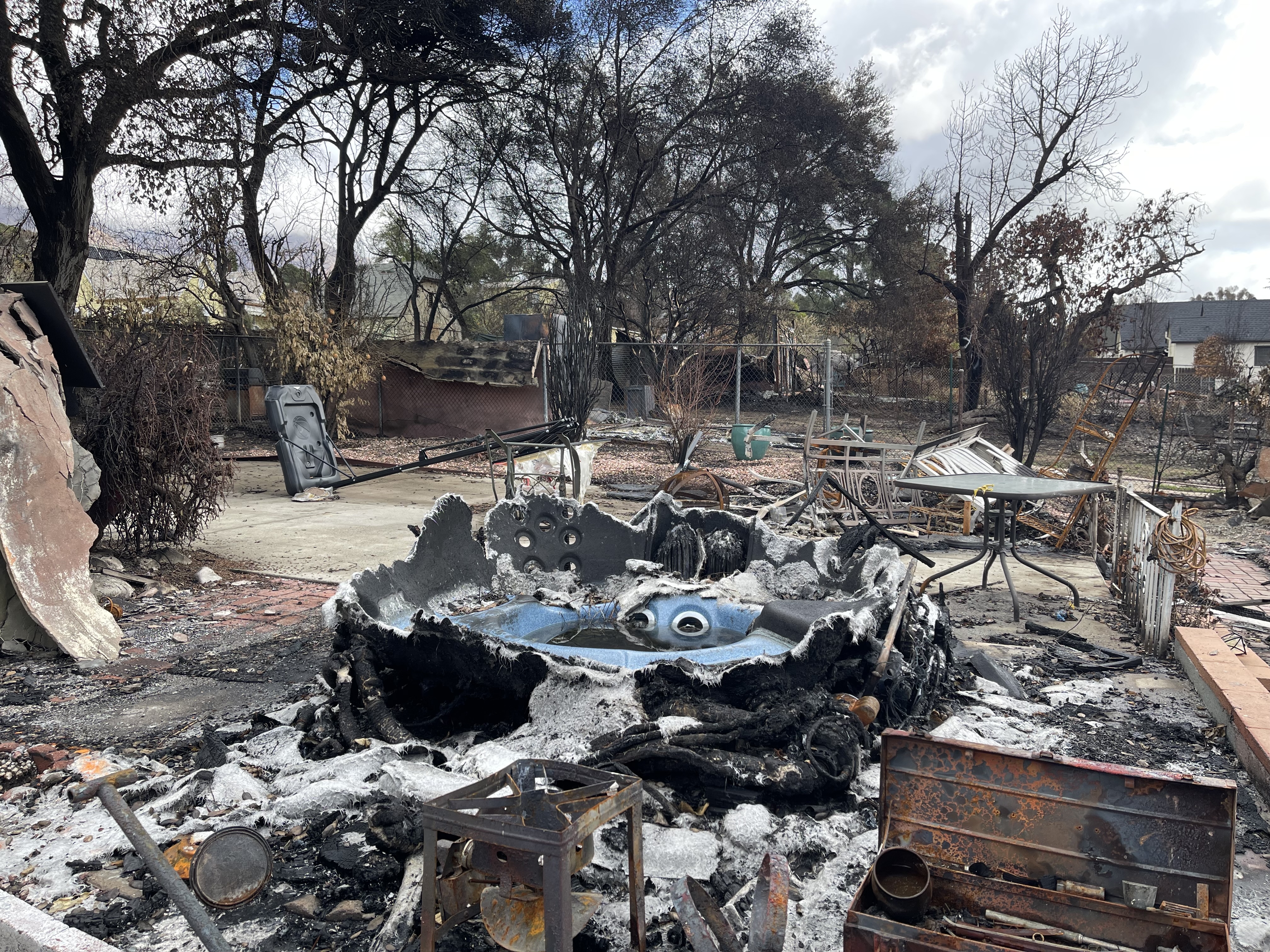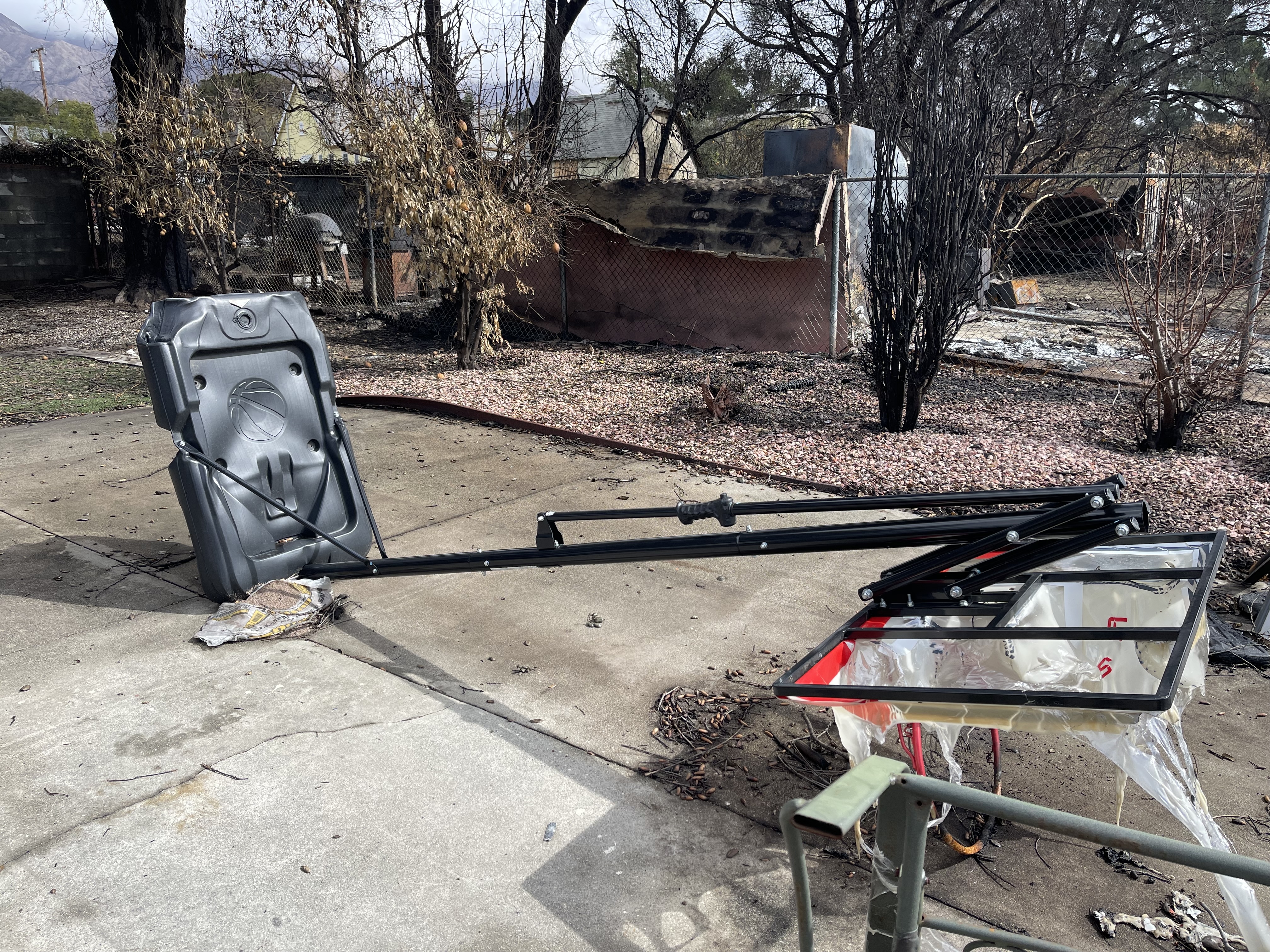 In what used to be his backyard, a melted basketball hoop had toppled onto the cement. “The court was actually way back here on the end,” he explained while pointing to the back of the yard. “It blew this way and then fell over and burned.” He’ll never forget teaching his 5-year-old grandson how to dribble through the cones he set up on the court.