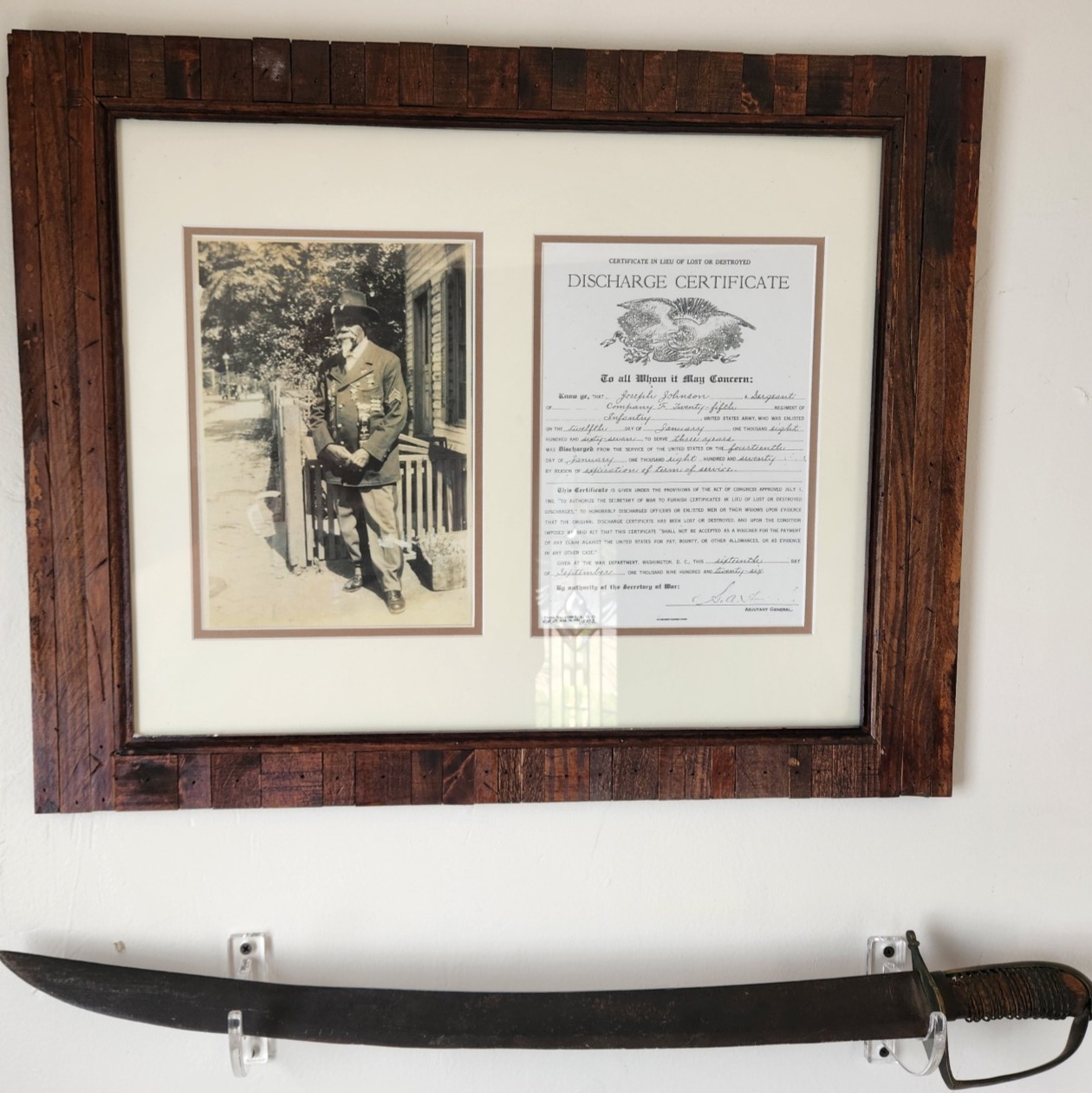 Left: Joe Ford holds his great-grandfather’s sword from the Civil War, a family keepsake he found in the rubble of his home. Right: Framed photo of Joe Ford’s great-grandfather, who was a runaway slave, in Washington D.C., and his discharge papers from the Civil War. (Photos courtesy of Joe Ford)