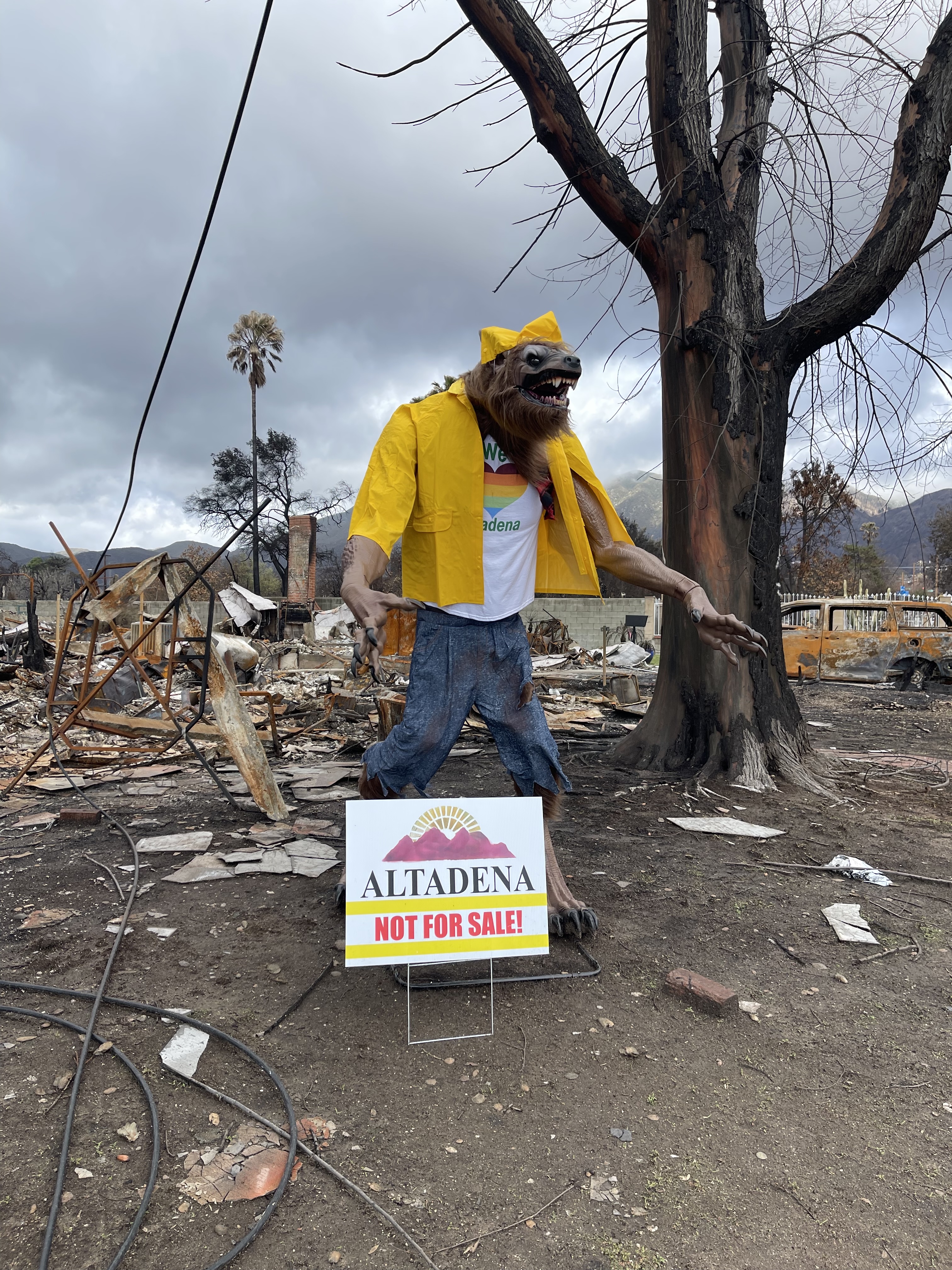 Wolf statue standing behind a sign that reads “Altadena not for sale!” (Photo by Sheridan Hunter)