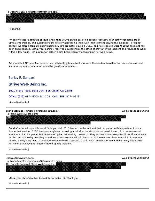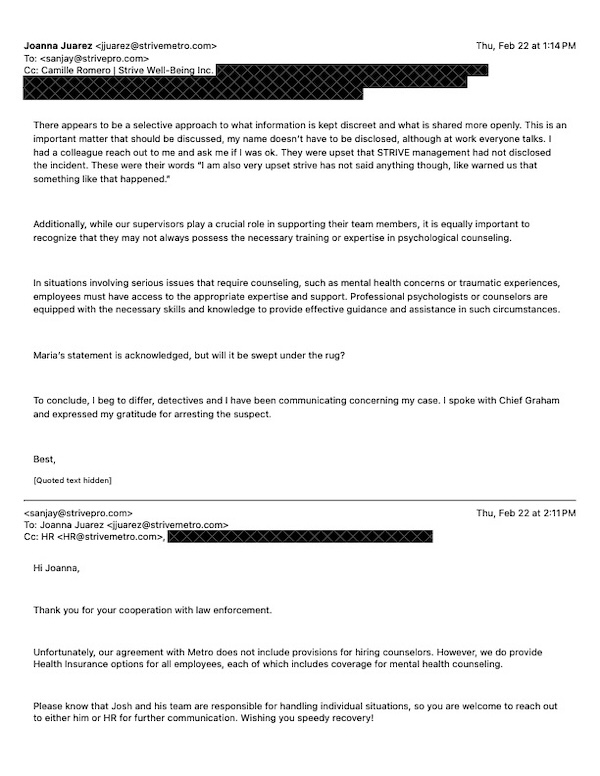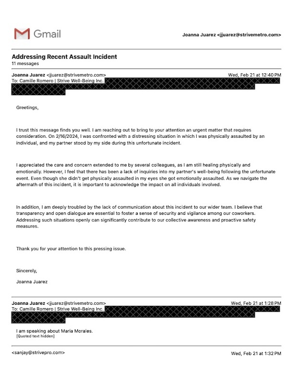After her attack, Juarez expressed her anger in an internal email on Feb. 21 to Strive Well-Being due to the lack of communication with other ambassadors about the incident, and the lack of support for her partner who was present during the attack.