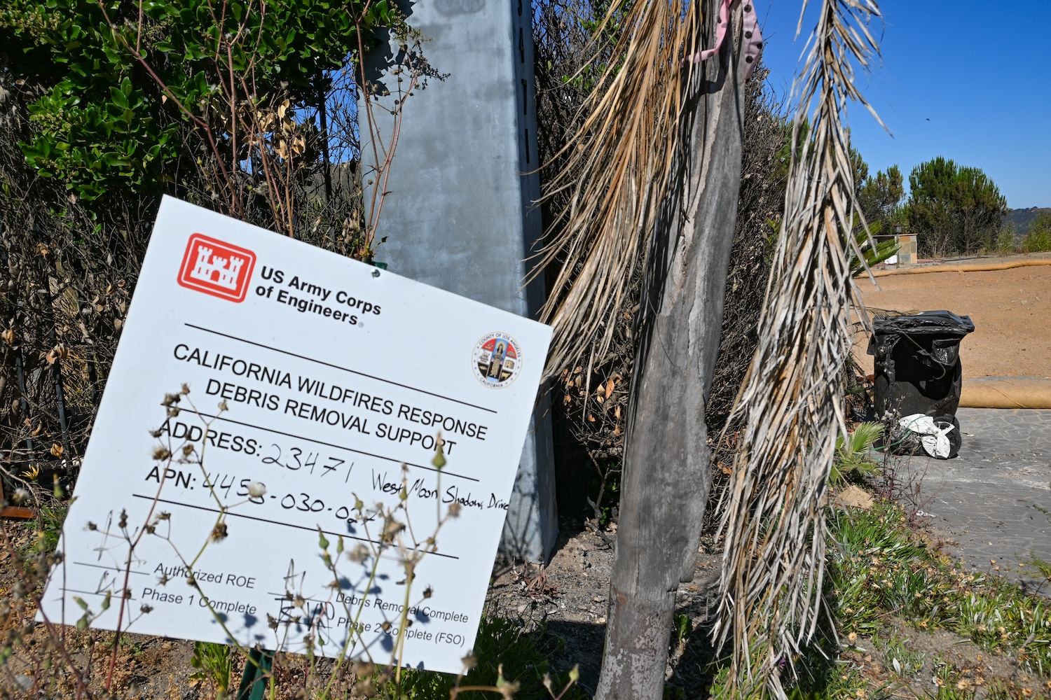 A California Wildfires Response Debris Removal Support sign, signifying that Phase-1 of debris removal has been completed. To the right, a melted trash bin still remains. (Avidha Raha/USC Annenberg Media)