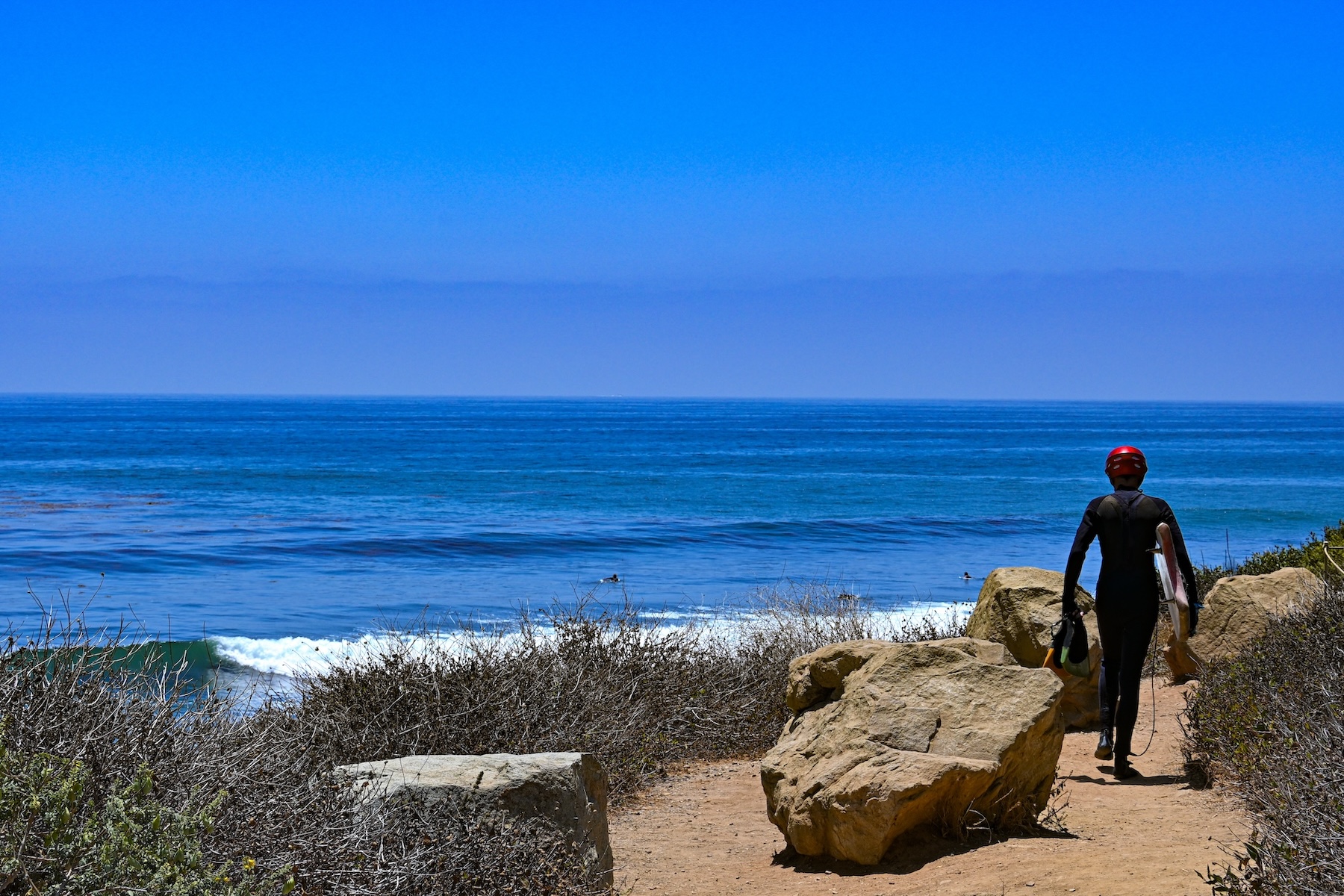 A fully-equipped surfer walking down from a cliff into the ocean. (Avidha Raha/USC Annenberg Media)