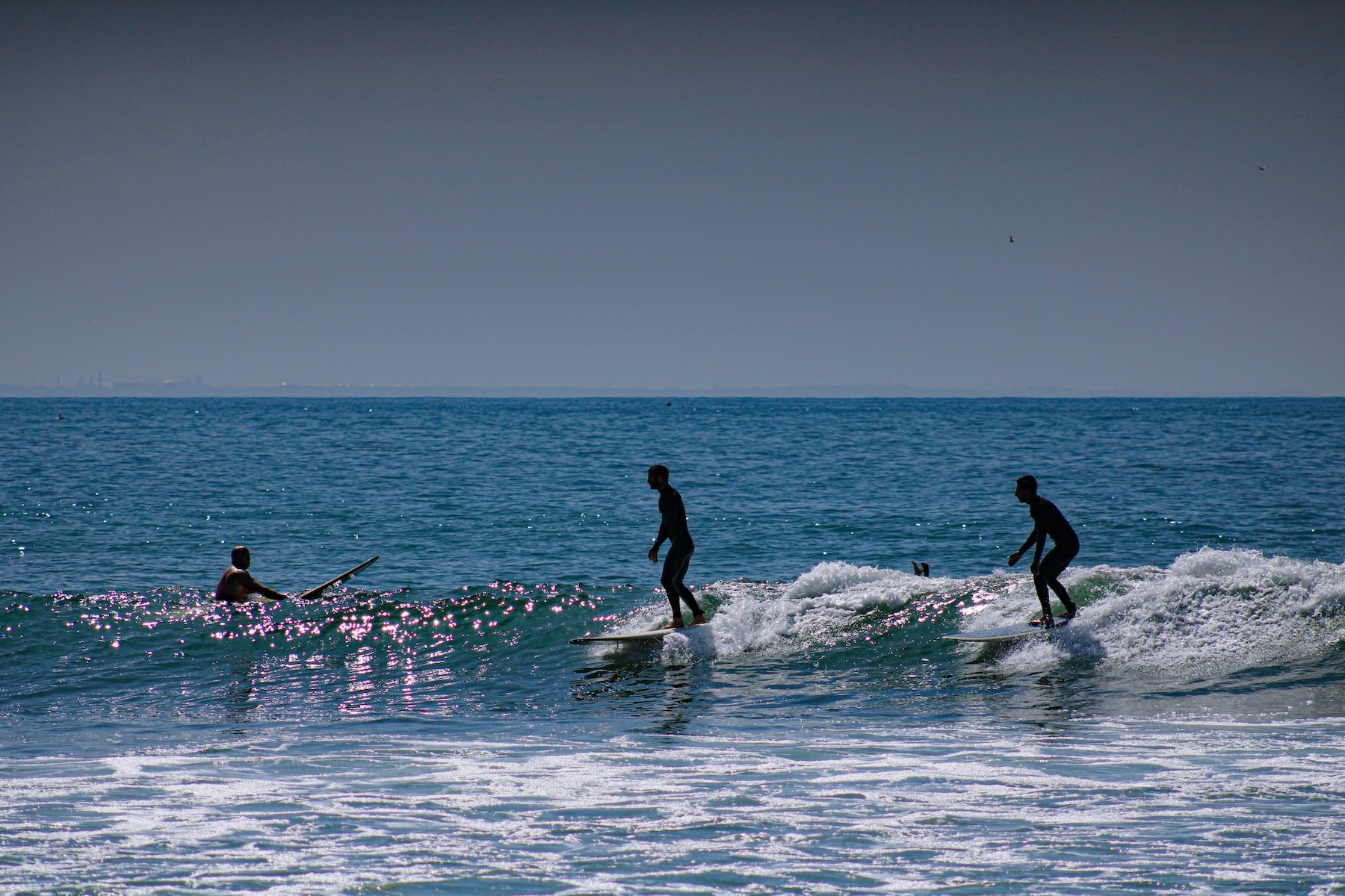Silhouettes of local surfers riding a wave. (Constanza Montemayor/USC Annenberg Media)