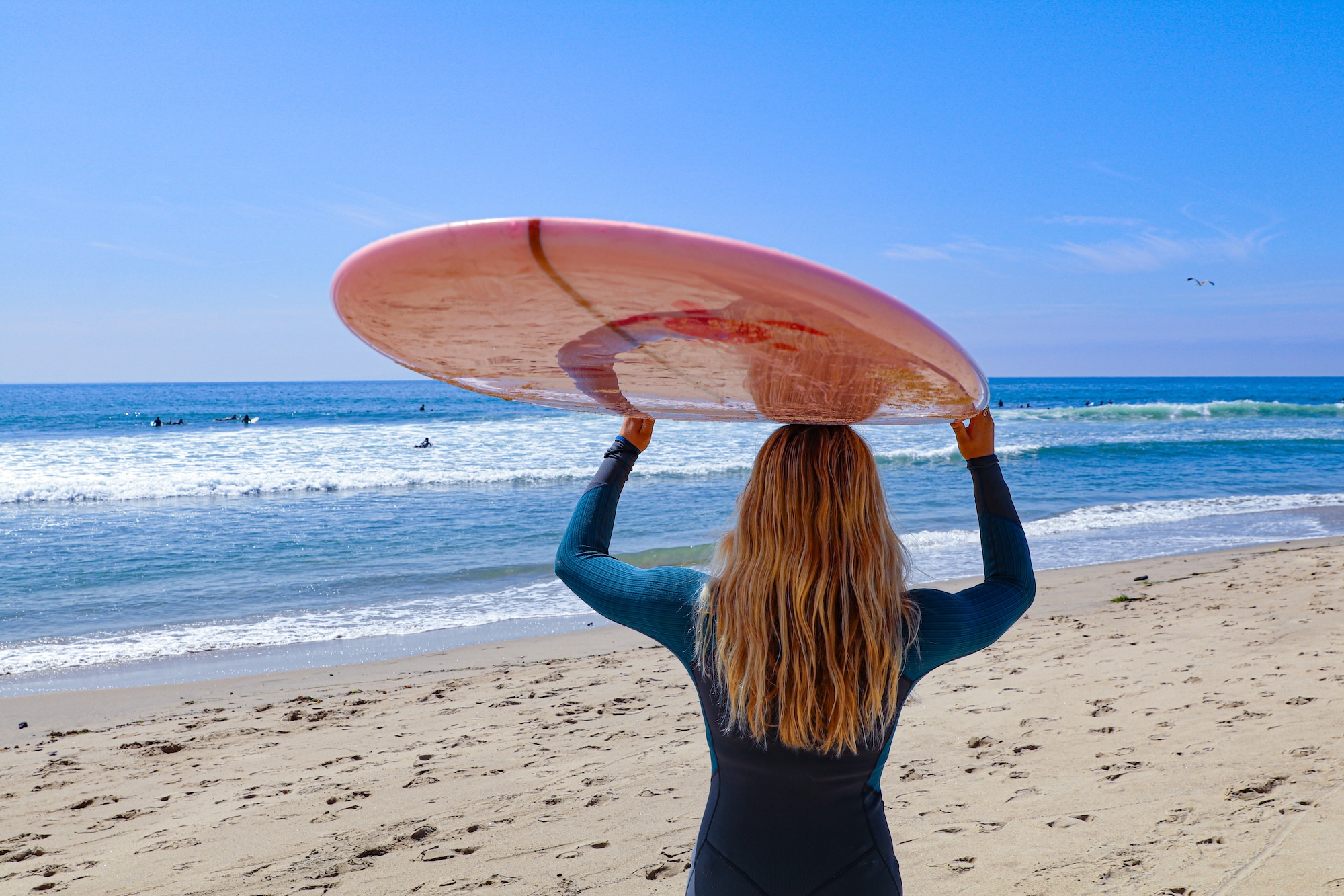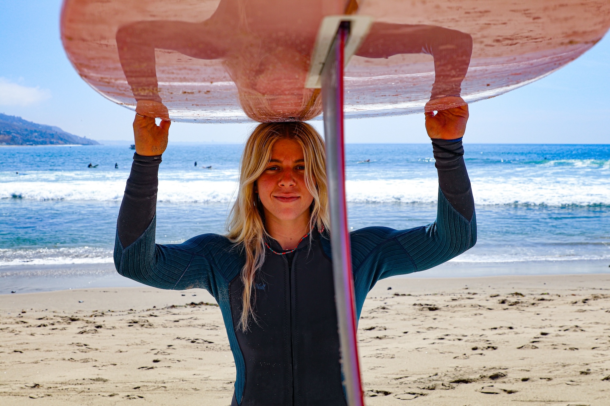 Chloe Sobel with her surfboard at Malibu Surfrider Beach at the end of July. (Rosaura Wardsworth/USC Annenberg Media)