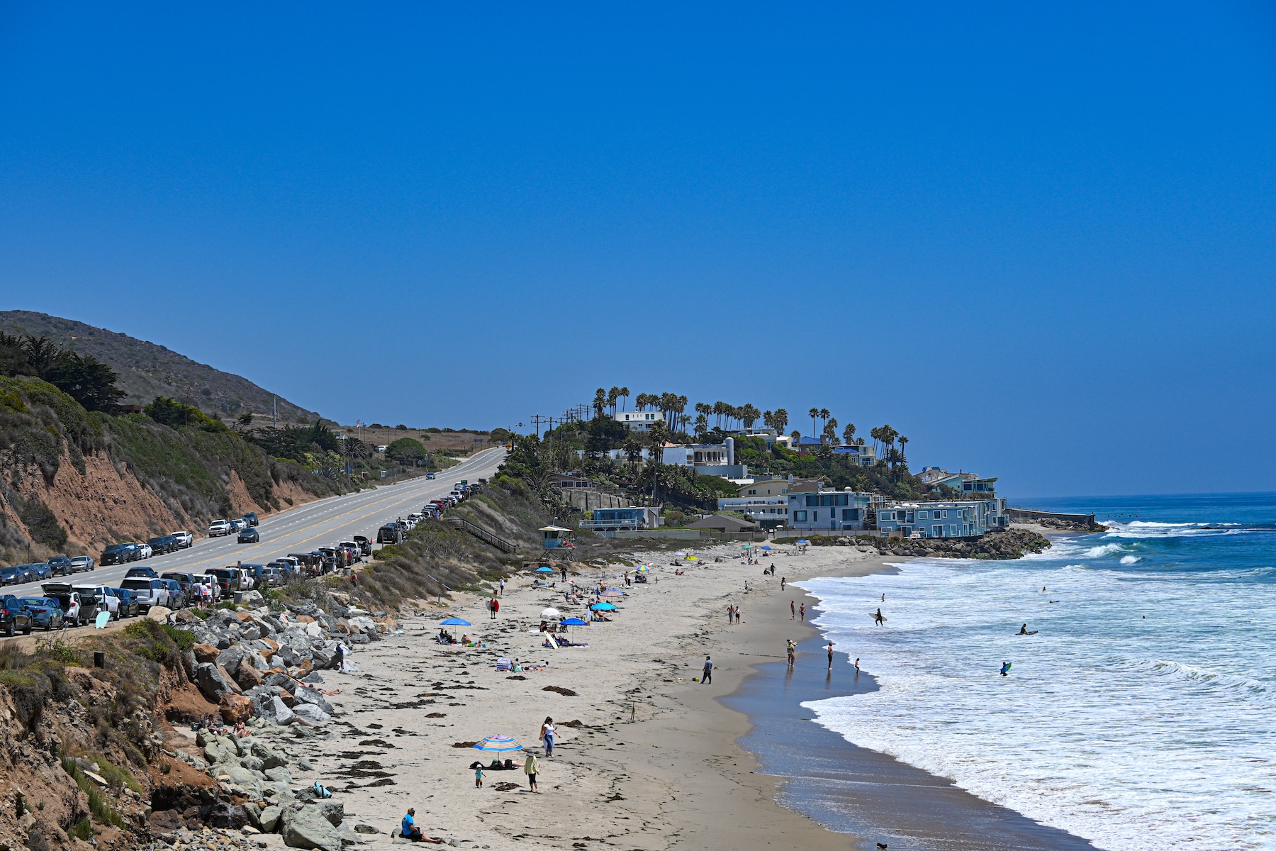 The scenic Malibu beach, packed with visitors on a weekend afternoon. (Avidha Raha/USC Annenberg Media)