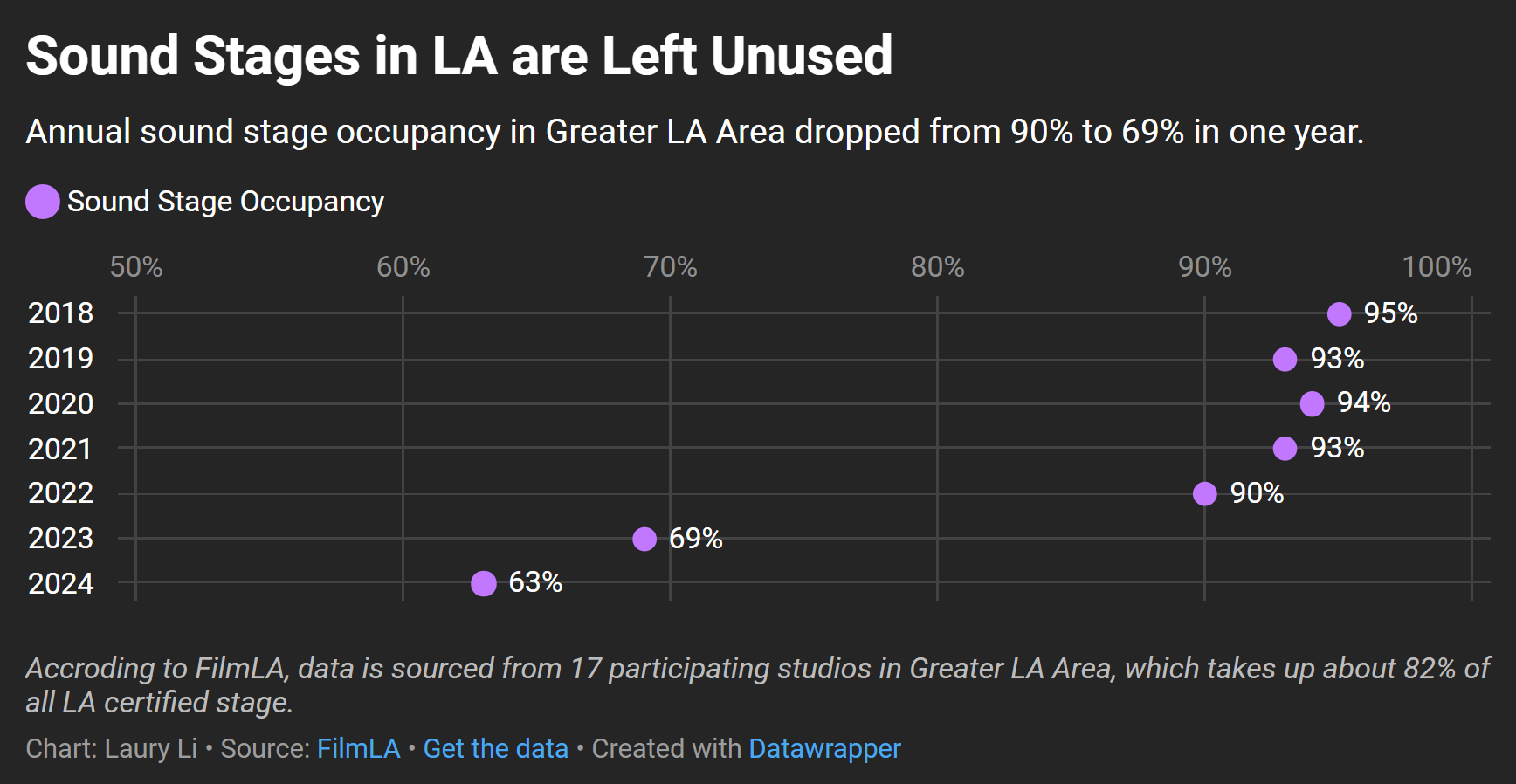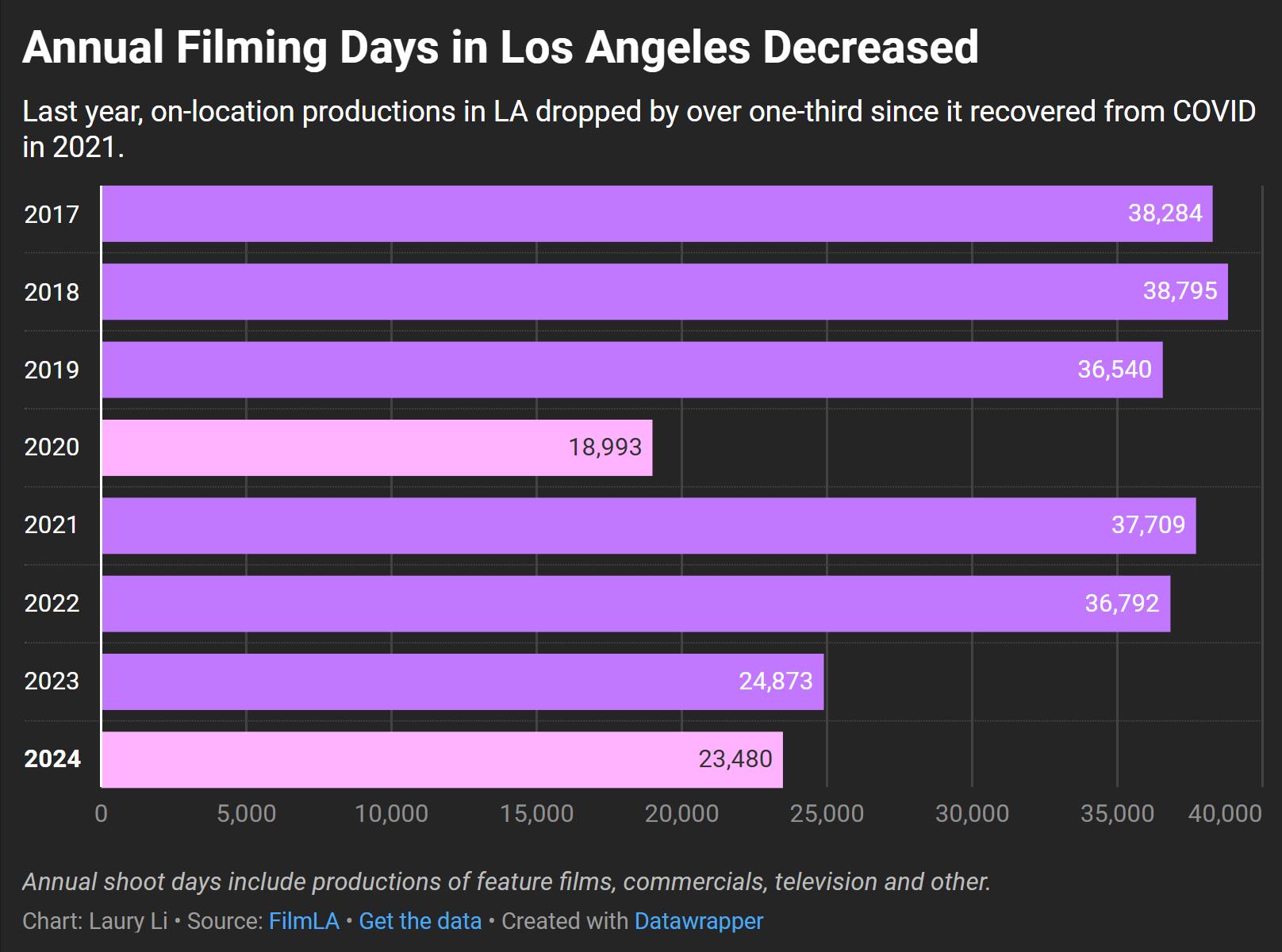 Los Angeles film shoot days have decreased by 35 percent annually since 2019, according to a 2024 FilmLA report. Specifically, television's annual shoot days are down by nearly 50 percent.